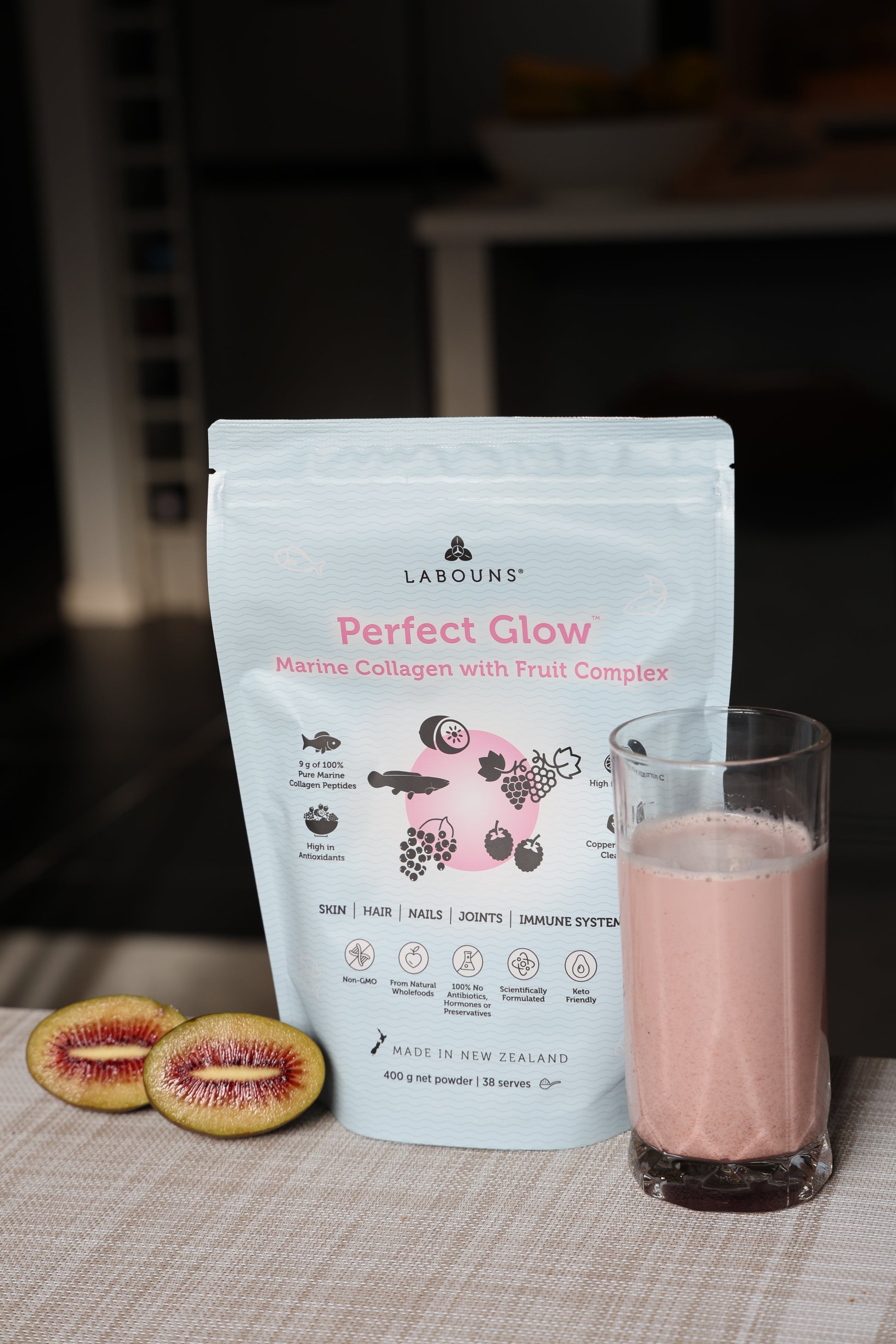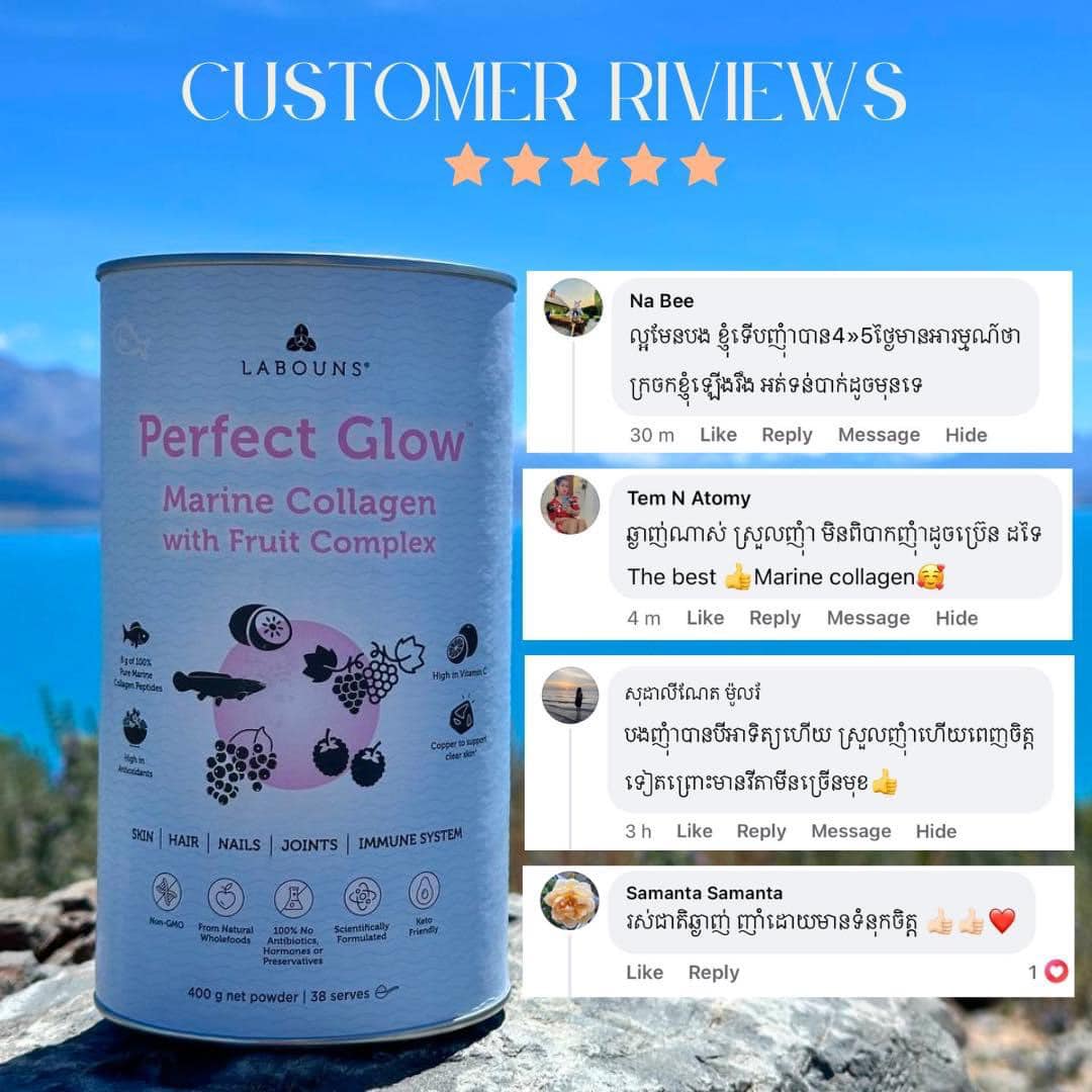 Labouns® Perfect Glow™ is a unique formulation that blends the highest quality marine collagen with a fruit complex, helping you achieve your perfect glow for a youthful, healthy appearance, both inside and out⁺.